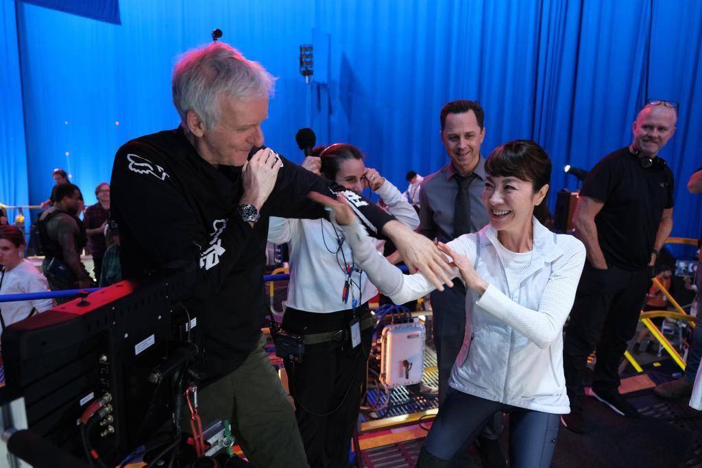詹姆斯·卡梅隆(左)与杨紫琼等在《阿凡达3》拍摄现场。