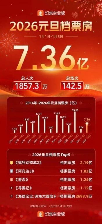 “请三休八”的拼假上升下,2026年电影市集迎来开门红。国度电影专资办及灯塔专科版泰斗数据炫耀,元旦档(1月1日-1月3日)总票房最终收报7.39亿元,较2025年同时大幅增长141%,创下同时票房新记载。