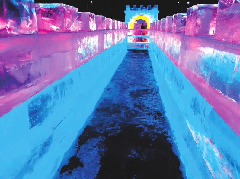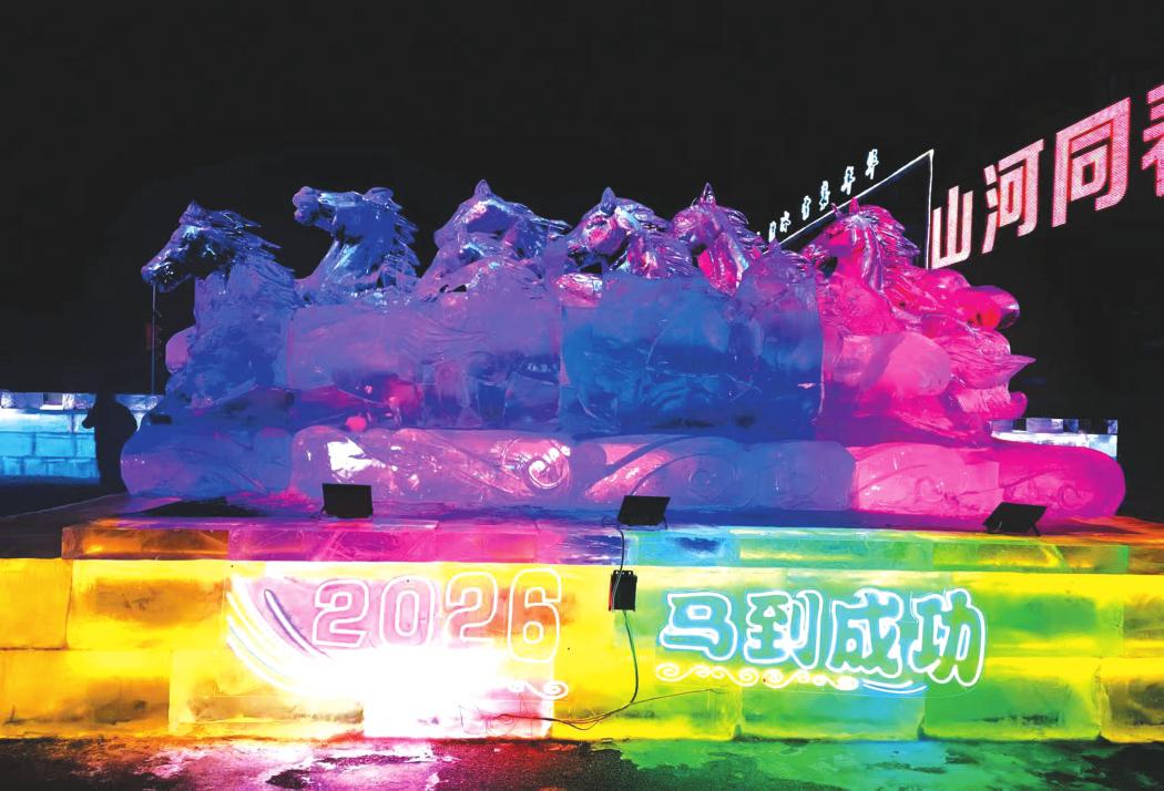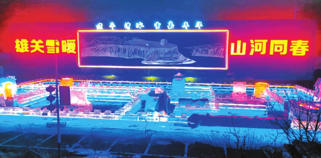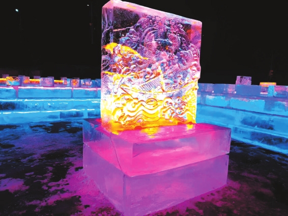 赏冰雕艺术。船埠区域的冰雕展,将黄河、长城文化与冰雪艺术隐讳聚合,晶莹彻亮中尽显雄关气韵。