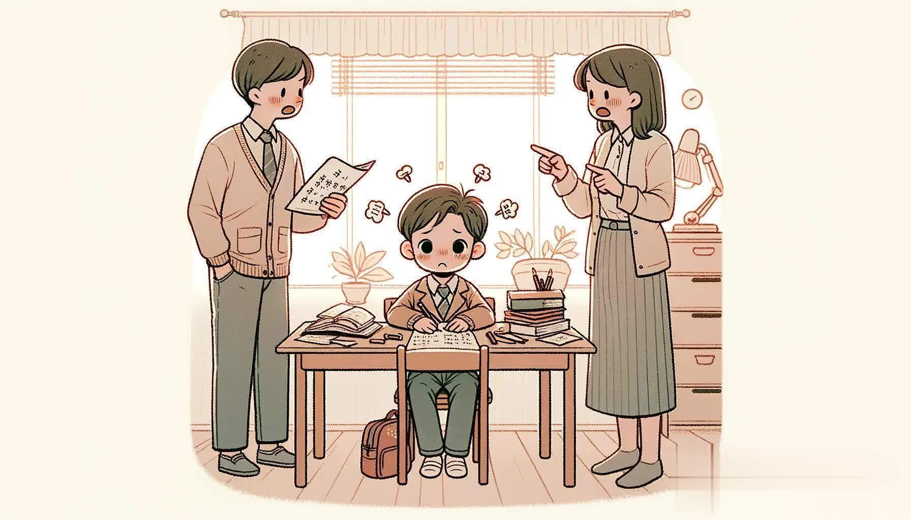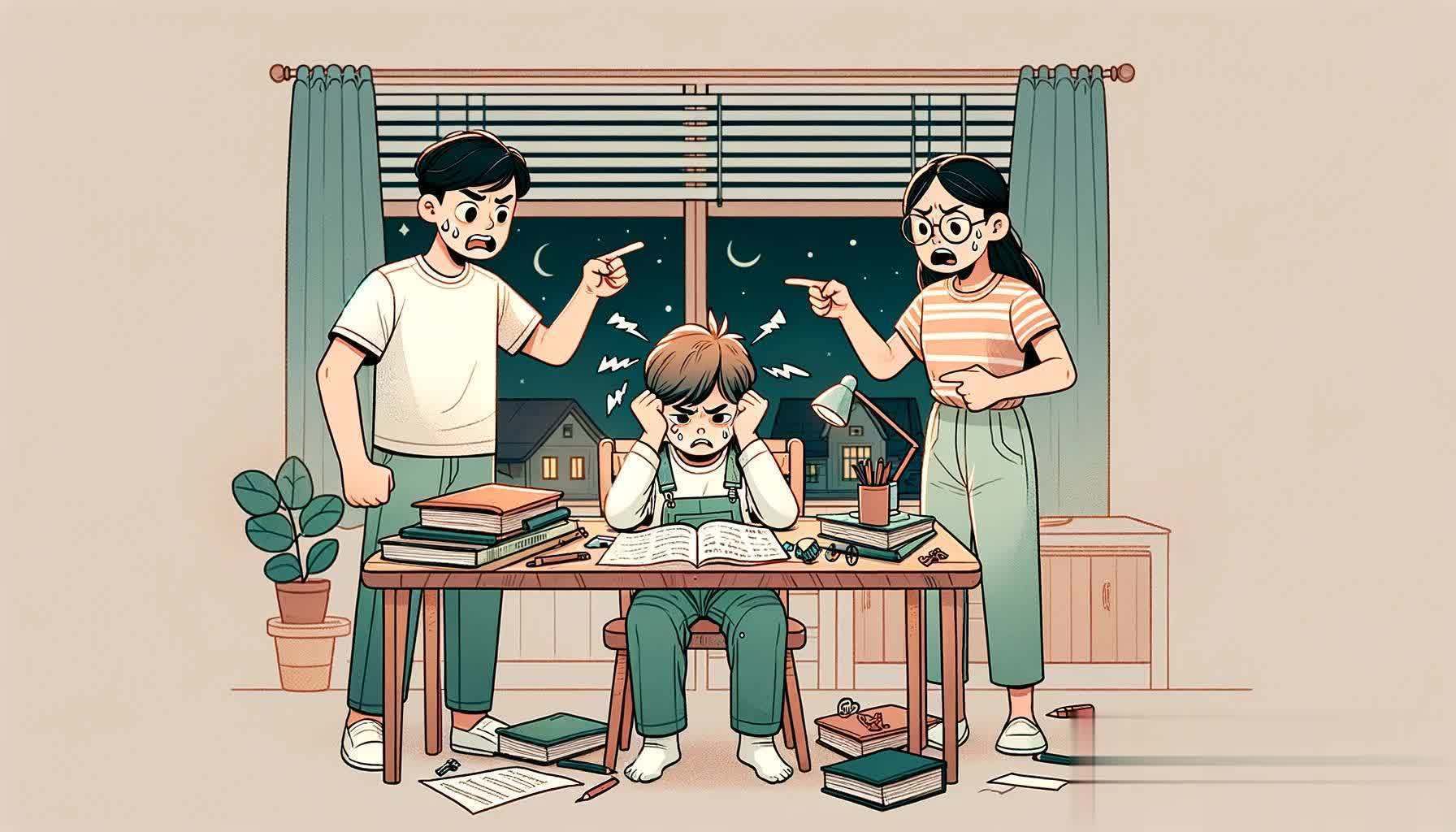 与此同期,父亲则静静地坐在一旁,手中拿着孩子的功课本。