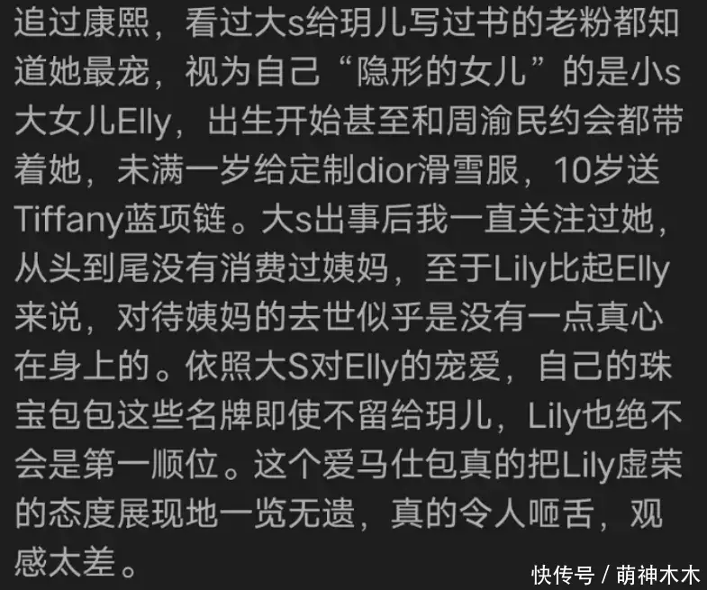 动不动就蹧跶大S,一边写小论文是曲姨妈大S,一边背着本该留给大S子女的大牌包出门游玩。
