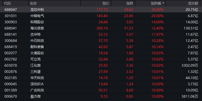 从行业板块和赛说念来看,若按照申万一级行业分辨,电子板块领涨,板块盘中涨幅高出2.8%,板块内个股掀翻涨停潮。龙芯中科、中熔电气“20cm”涨停,科翔股份、杰华异常多股涨幅高出10%,大港股份、江化微等10多只股票涨停。