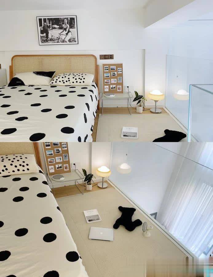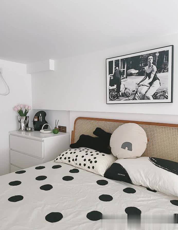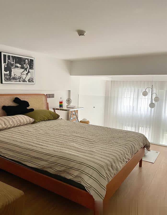 卧室是怒放式卧室,无主灯,全屋白色乳胶漆,床和床头柜是原木色