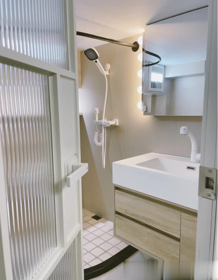 ✨马桶作念了壁挂式,荫藏水箱亦然为了空间✨风暖用了侧装,亦然为了省上头的空间✨浴室柜用的原木风柜,80cm白色台盆,这么显得温馨,镜柜也很实用,不错装好多,保抓台面整洁,东西能上墙上墙
