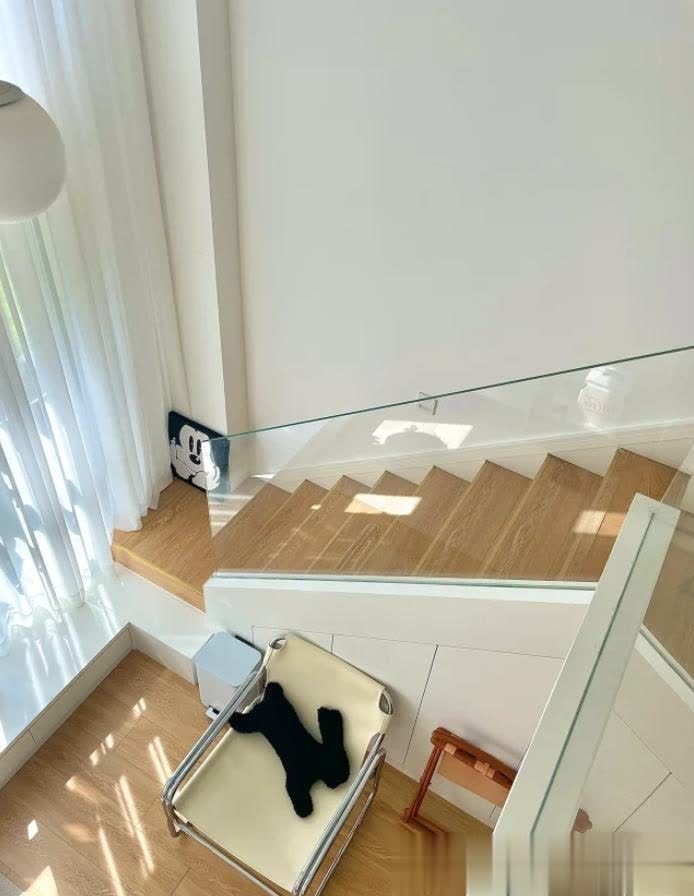 钢构楼梯,再平直铺地板,一共作念了12阶,高17cm 宽23cm 长80cm。护栏用的是超白钢化玻璃,莫得加扶手框,嗅觉这么更通透,何况侧面用的是一整块;楼梯底下作念了储物间,通盘杂物王人放内部