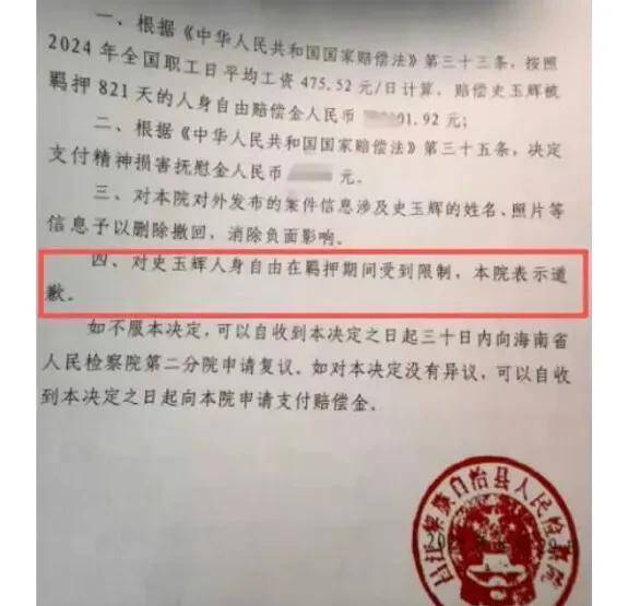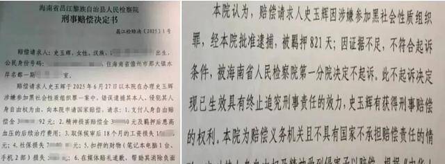 2025年8月29日,昌江县调查院作念出《刑事抵偿决定书》,调查机关认为,抵偿请求东谈主史玉辉因涉嫌参加黑社会性质组织罪,经本院批准逮捕,被羁押821天;因笔据不及,不合适告状条款,被海南省东谈主民调查院第一分院决定不告状。