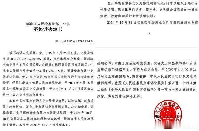 2025年5月23日,海南省东谈主民调查院认为史玉辉犯参加黑社会性质组织罪笔据不及,不合适告状条款,下达《不告状决定书》。