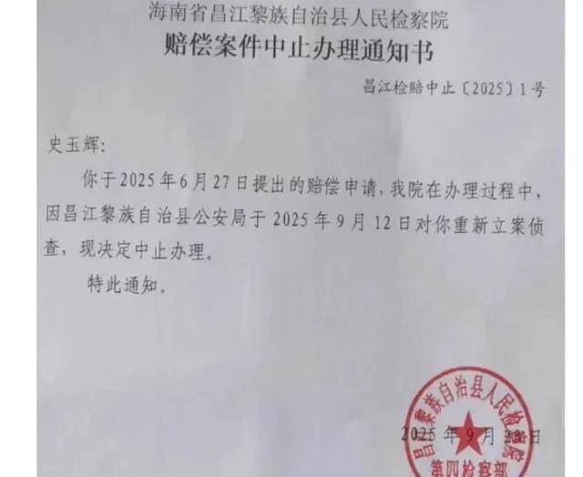 “2025年9月23日,昌江县调查院又作念出了一份《抵偿案件中止办理讲演书》,”史玉辉说,这份讲演书说她提议的抵偿恳求在办理过程中,因昌江县公安局于2025年9月12日对她从头立案考核,现决定中止办理。