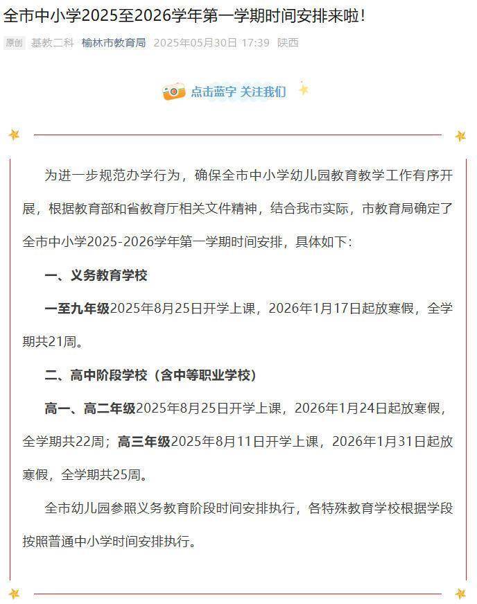 榆林市诠释局已发布榆林市中小学2025至2026学年第一学期技能安排。