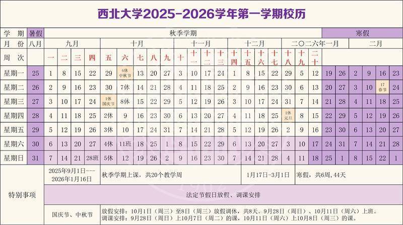 西北大学的寒假技能为2026年1月17日至2026年3月1日,共6周44天。