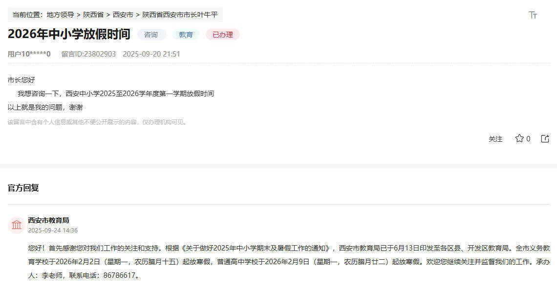 “我念念商讨一下西安市中小学2025至2026学年第一学期休假技能。”近日,别称陕西网友在东谈主民网“换取留言板”的留言,赢得关系部门回话。